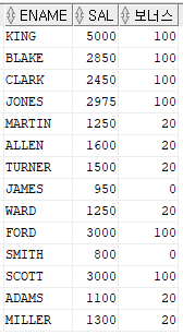 select ename, sal, deptno, decode(deptno,10,5000,0) 보너스