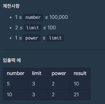 기사단원의 수를 나타내는 정수 number와 이웃나라와 협약으로 정해진 공격력의 제한수치를 나타내는 정수 limit와 제한수치를 초과한 기사가 사용할 무기의 공격력을 나타내는 정수 power가 주어졌을 때, 무기점의 주인이 무기를 모두 만들기 위해 필요한 철의 무게를 return 하는 solution 함수를 완성하시오.