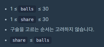 머쓱이는 구슬을 친구들에게 나누어주려고 합니다. 구슬은 모두 다르게 생겼습니다. 머쓱이가 갖고 있는 구슬의 개수 balls와 친구들에게 나누어 줄 구슬 개수 share이 매개변수로 주어질 때, balls개의 구슬 중 share개의 구슬을 고르는 가능한 모든 경우의 수를 return 하는 solution 함수를 완성해주세요.