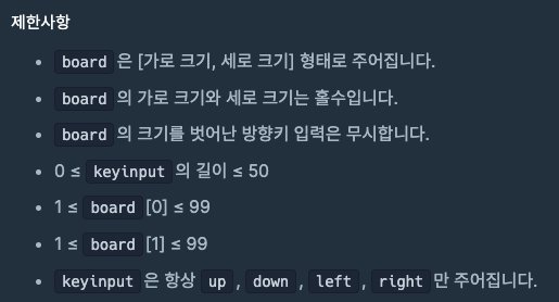 - [0, 0]은 board의 정 중앙에 위치합니다. 예를 들어 board의 가로 크기가 9라면 캐릭터는 왼쪽으로 최대 [-4, 0]까지 오른쪽으로 최대 [4, 0]까지 이동할 수 있습니다.